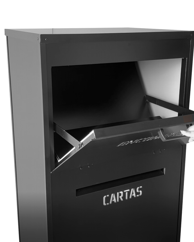 Abertura frontal exclusiva com sistema de travas que impede o acesso às encomendas acumuladas.